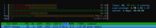 gzip の限界 = CPU 1コア マルチコア・マルチスレッドのCPUがあるのに、gzip や lzma(xz)や bzipといったメジャーな圧縮は、CPUを1コアで処理するんですね。 CPU使用率を見てみたら、CPU利用率は100%を超えないんですね。 HDD・SSDの書き込み速度に限界が…