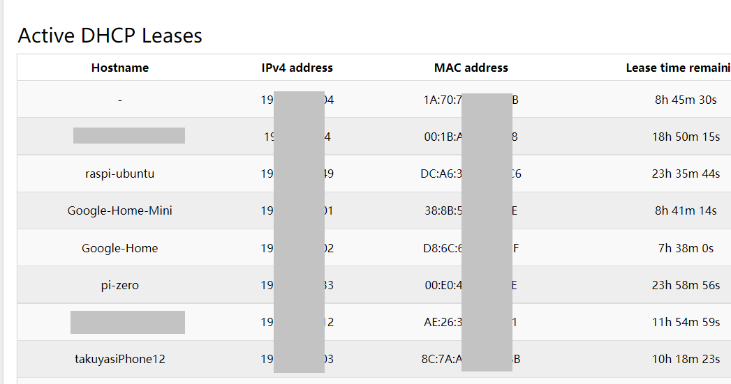 ルータのDHCPの割当一覧の例。ルータにだいたいでてる。