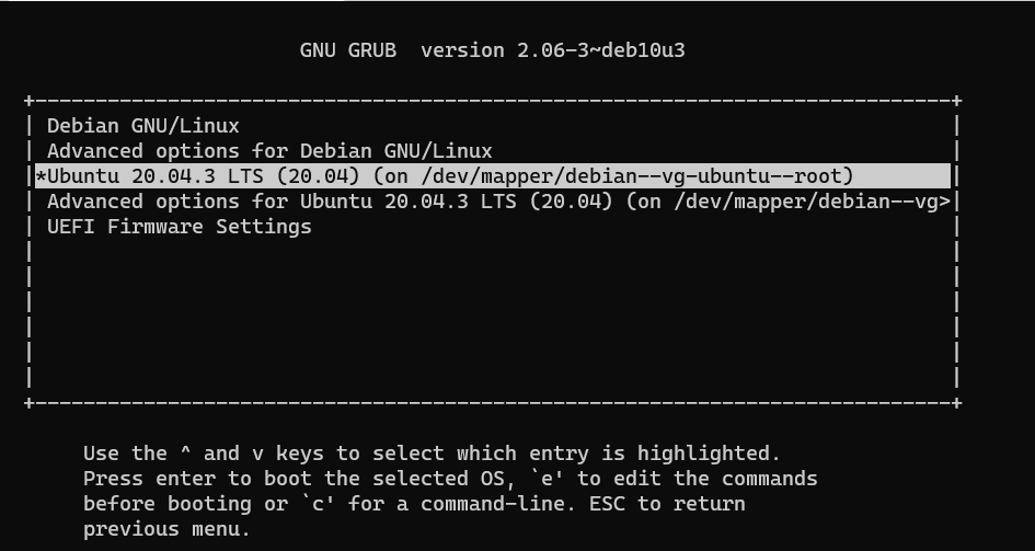 ここまでで、EFIパーティションでDebianのGRUBメニュからUbuntuを起動している。