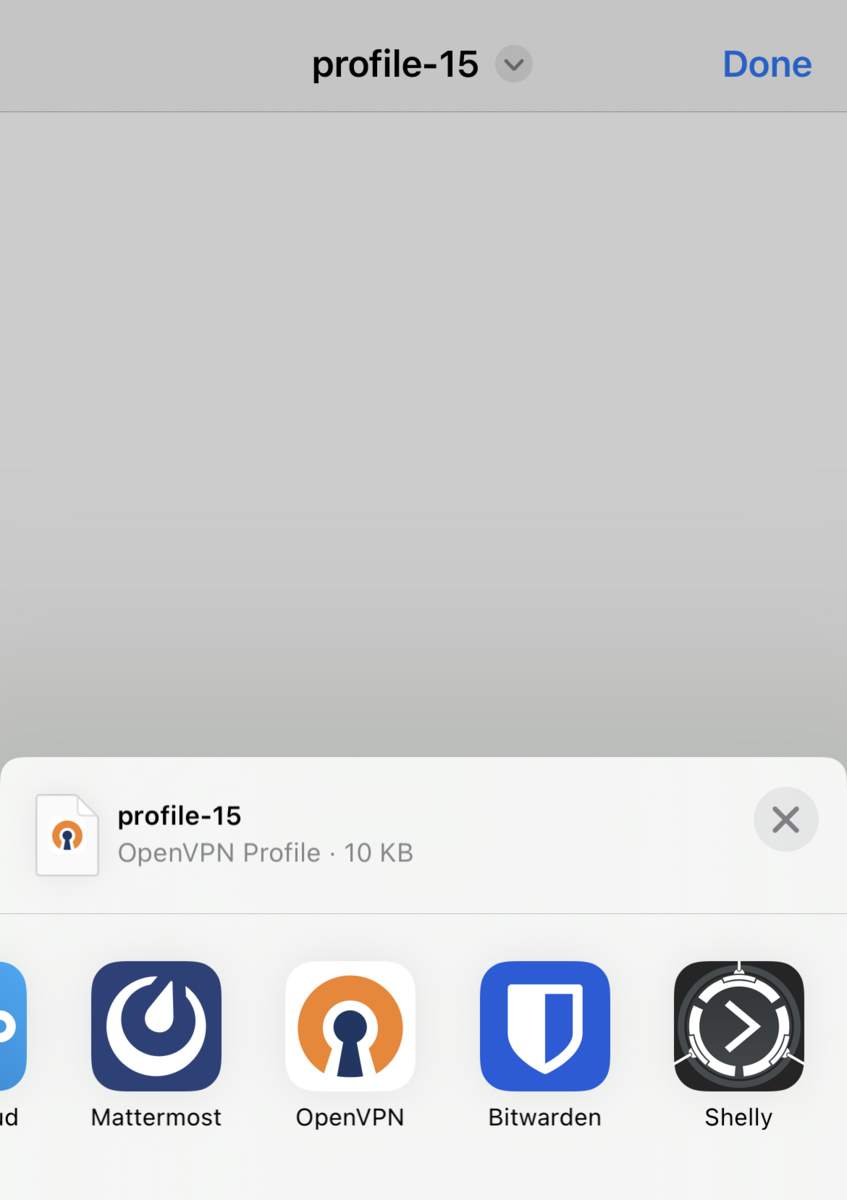 シェアシート(↑)を開いて、OpenVPNを指定する。